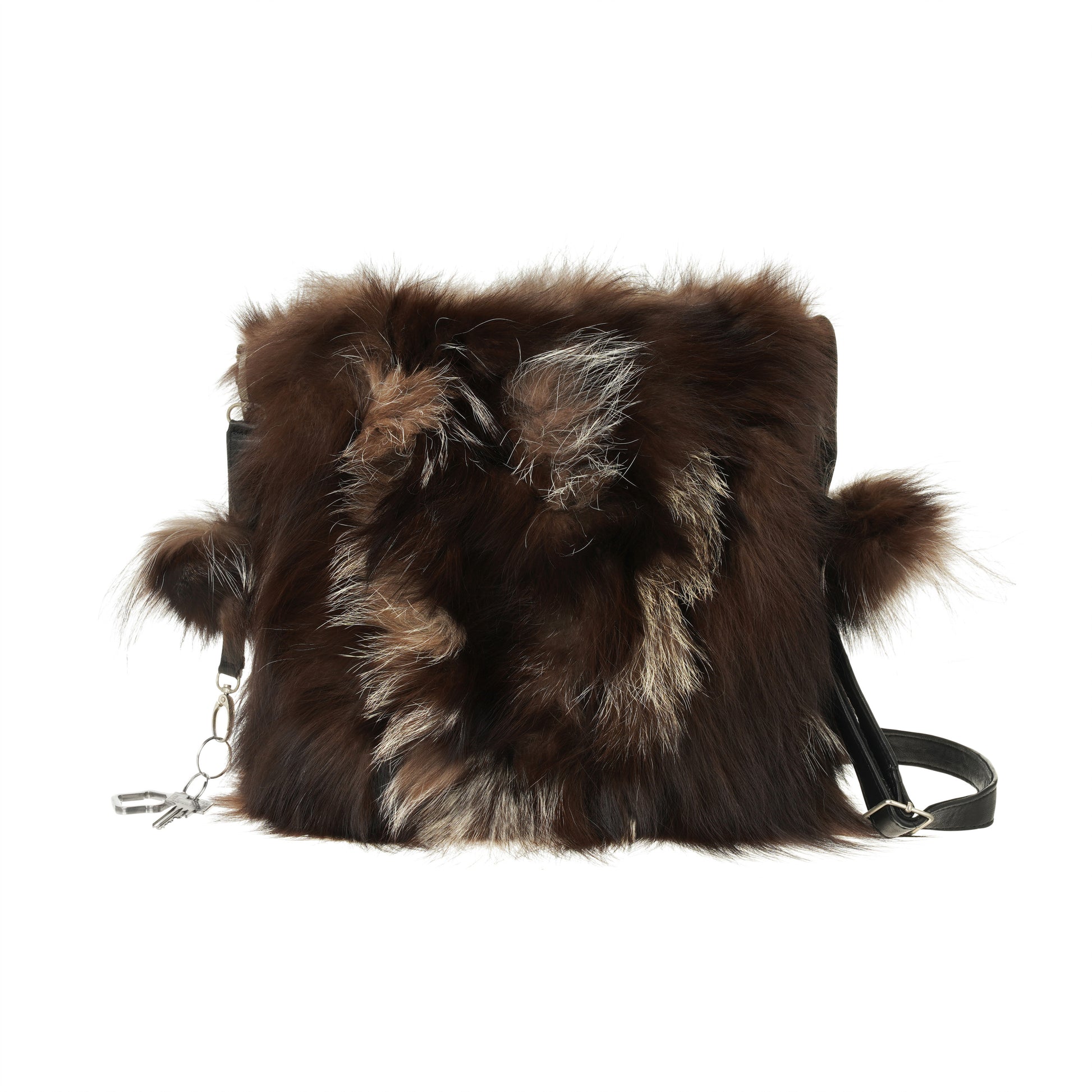 A plush fox fur bag with a gently rounded shape and signature side fur pom-poms.