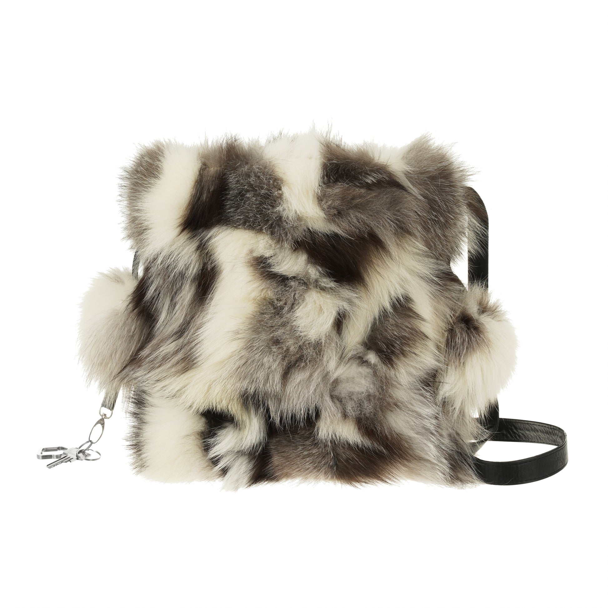 A plush fox fur bag with a gently rounded shape and signature side fur pom-poms.
