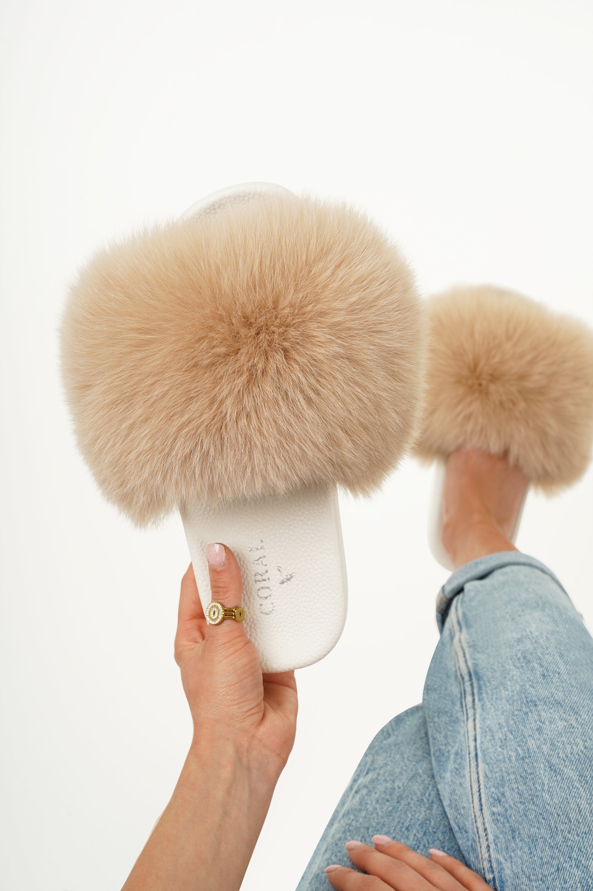 Crafted with real natural fur, each pair features natural variations in colour and texture, characteristic of the material. The lightweight PVC sole ensures comfort and stability while maintaining a clean, contemporary silhouette.