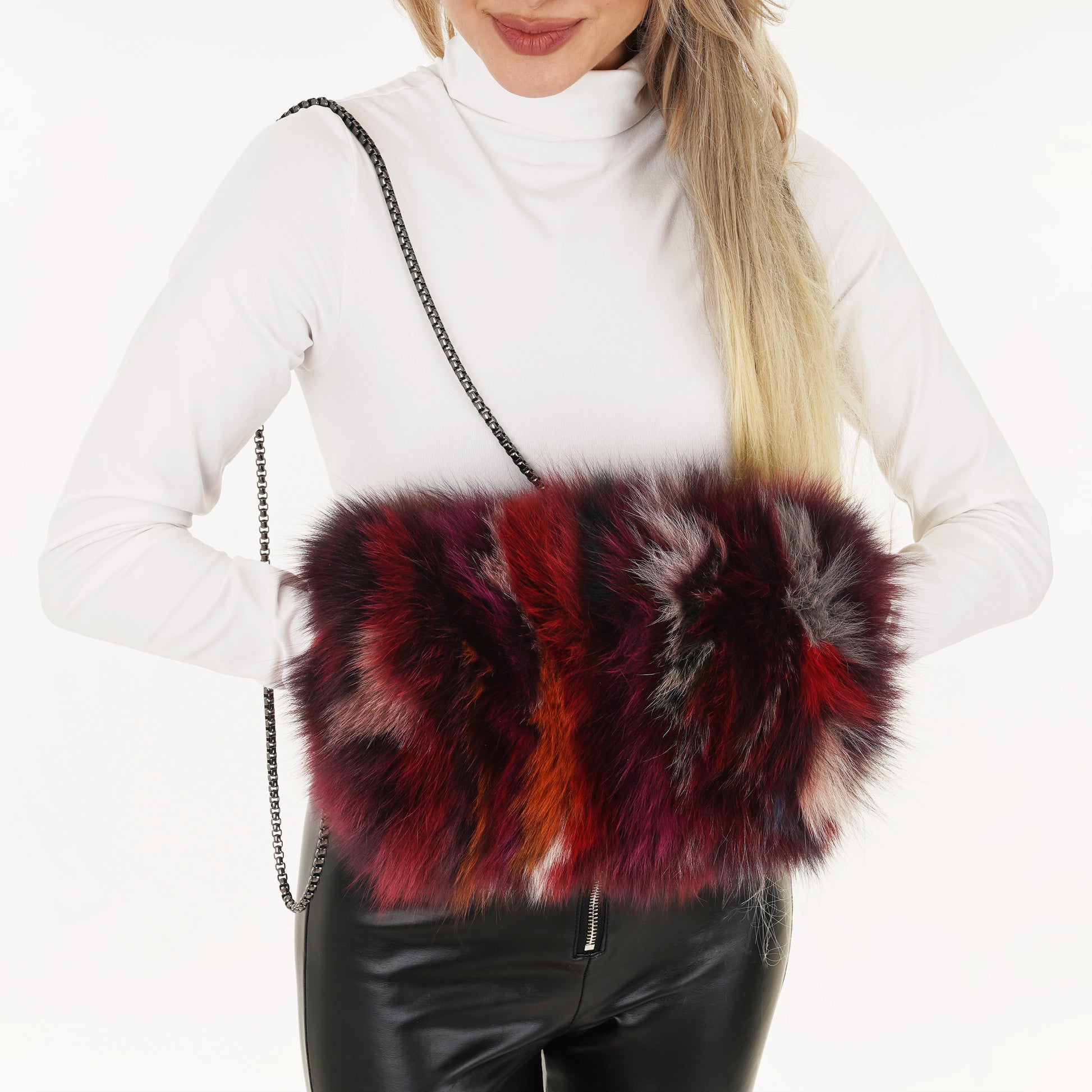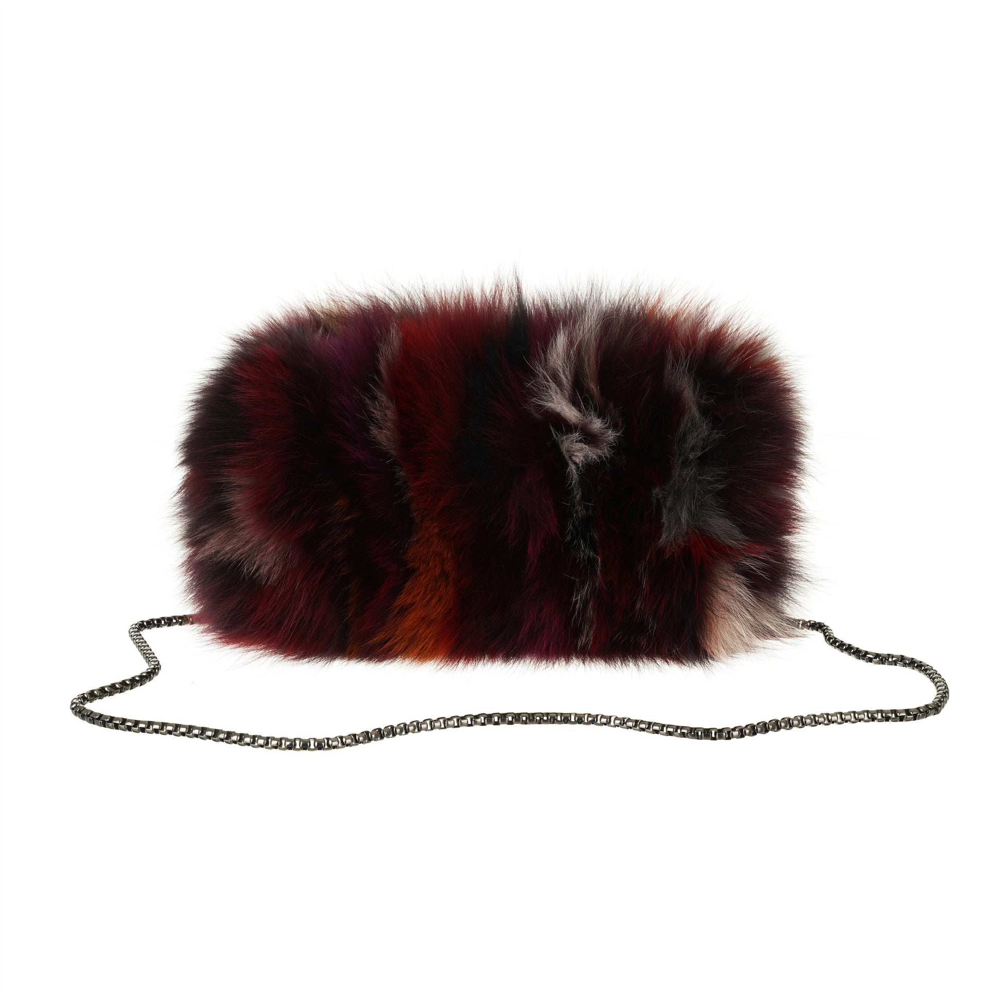 A soft, luxurious fox fur bag in rich burgundy tones with subtle blends of plum, copper and silver.